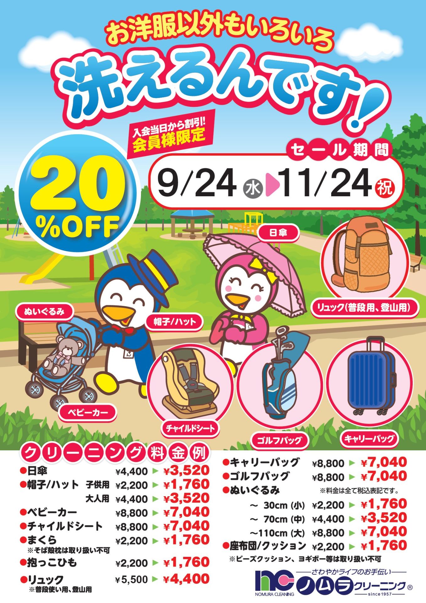 2025.09.23 セール情報 洗えるんですセール20%off:2025/9/24~11/24 <セール期間>2025年9月24日(水)〜11月24日(祝) 直営全店協賛セール ※ekimo梅田店は除く ◆会員様限定セールです。◆但し、ご入会当日から割引サービスいたします。【対象品】・日傘、帽子、まくら、ぬいぐるみ、座布団、クッション・ベビーカー、チャイルドシート、抱っこひも・キャリーバッグ、ゴルフバッグ、リュック(普段用、登山用) 前の記事へ 次の記事へ 一覧へ戻る